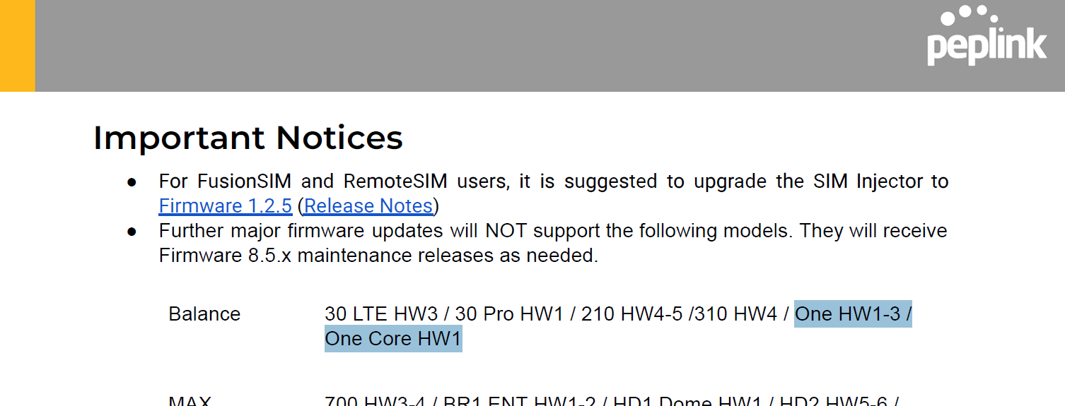 On page two of the Release notes for Firmware 8.5.3, it is mentioned, “Further major firmware updates will NOT support the following models. They will receive Firmware 8.5.x maintenance releases as needed. Balance One HW1-3 / One Core HW1”.
