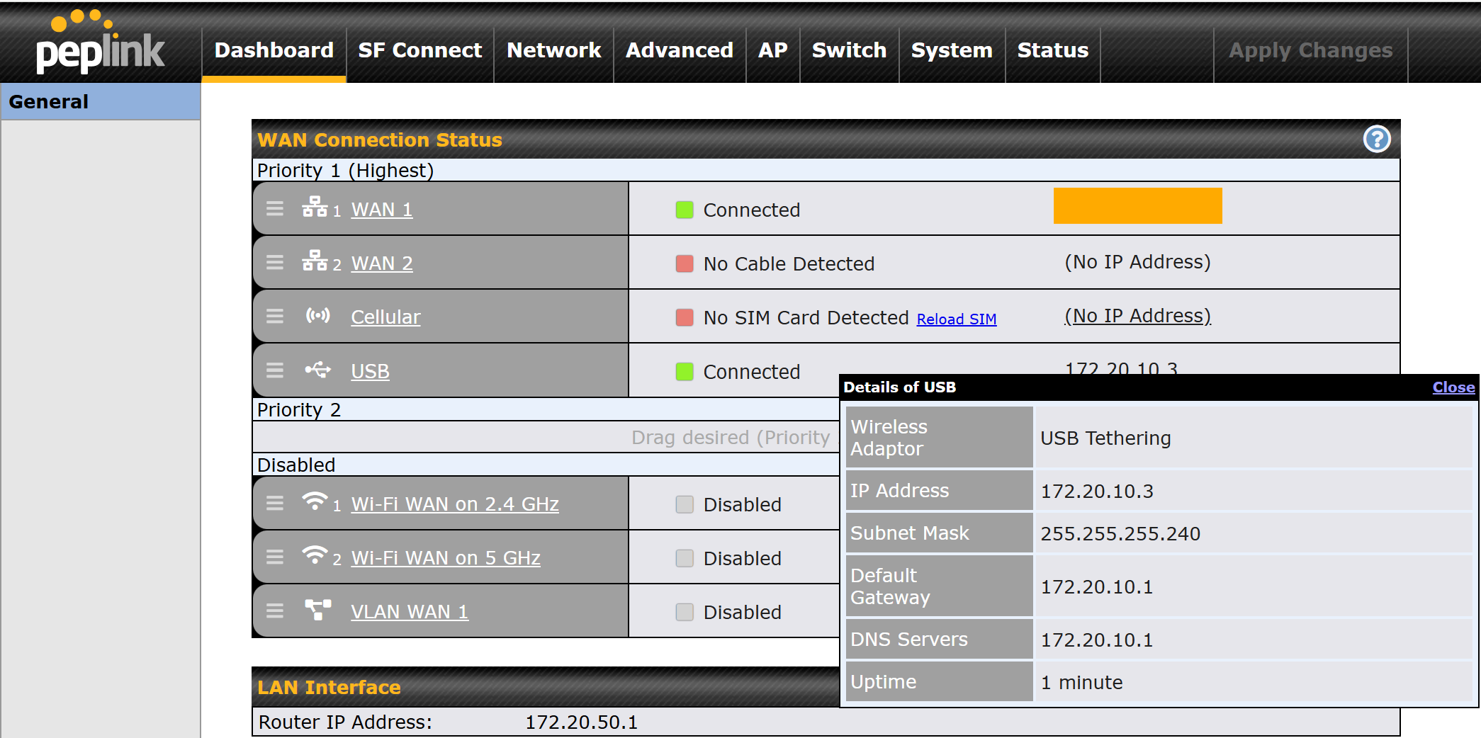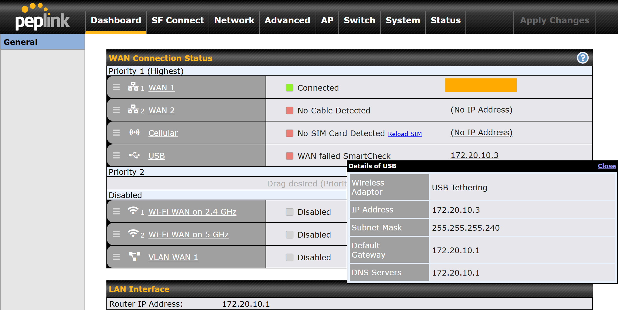 When the iPhone (and probally any USB modem or WAN) issues the same subnet as already used elsewhere on the routers networks (including VLANs), the USB connection will fail with errors like “WAN failed SmartCheck”.