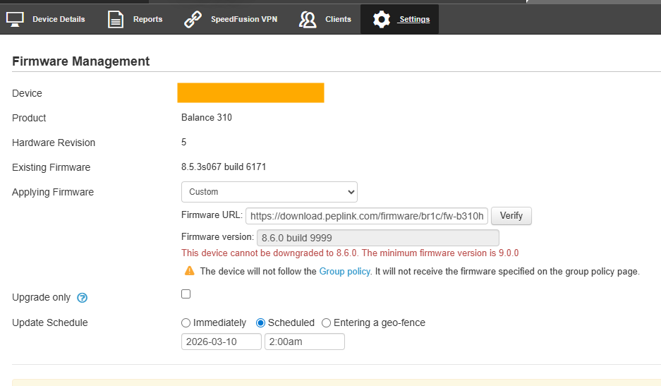The router failed to reconnect to the internet on our 2.5Gbps Fibre. The Synergised BR1 Pro 5G connected, though it would not pass internet traffic, as such the SpeedFusion tunnel would not establish. We managed to log in locally and rebooted the router back to firmware version 8.5.3s067 build 6171.