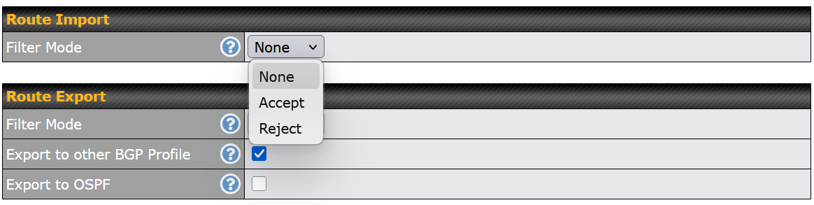 Currently in BGP under both Route Import and Route Export I can either accept or reject specific networks, but I can’t do both at the same time. I’d like to see a feature where both are possible.