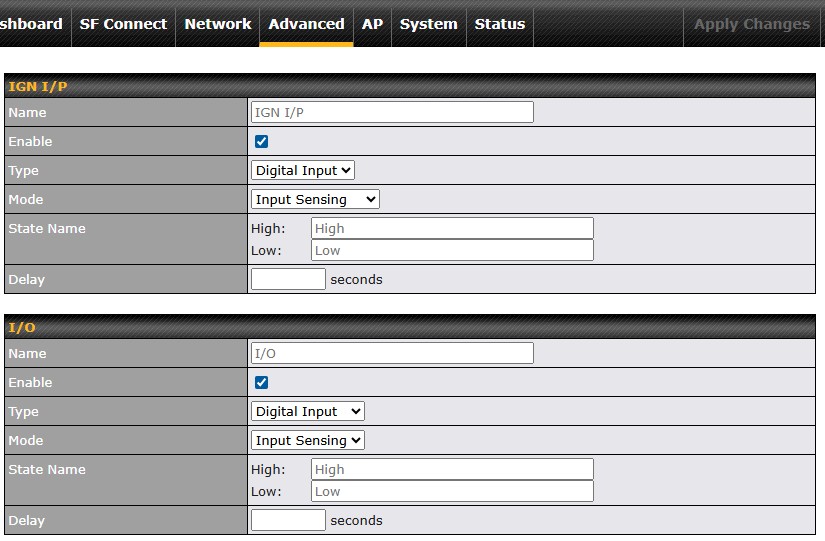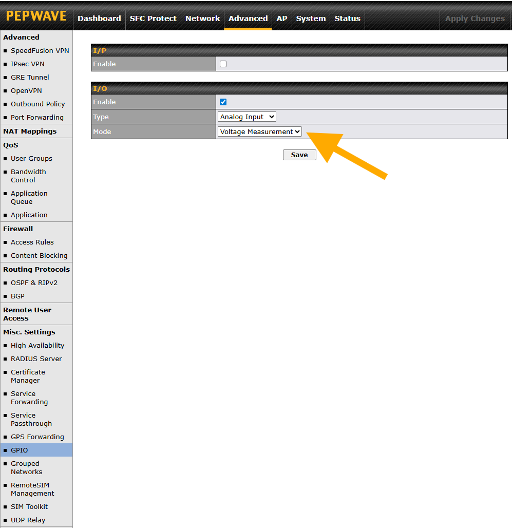I have checked several variants of the Peplink routers we have access to, including the Peplink MAX BR1, Peplink MAX BR2 and Peplink MBX HD4 Peplink & MBX Mini, and confirmed that the “Analogue Input” option is not presesented as an available option.