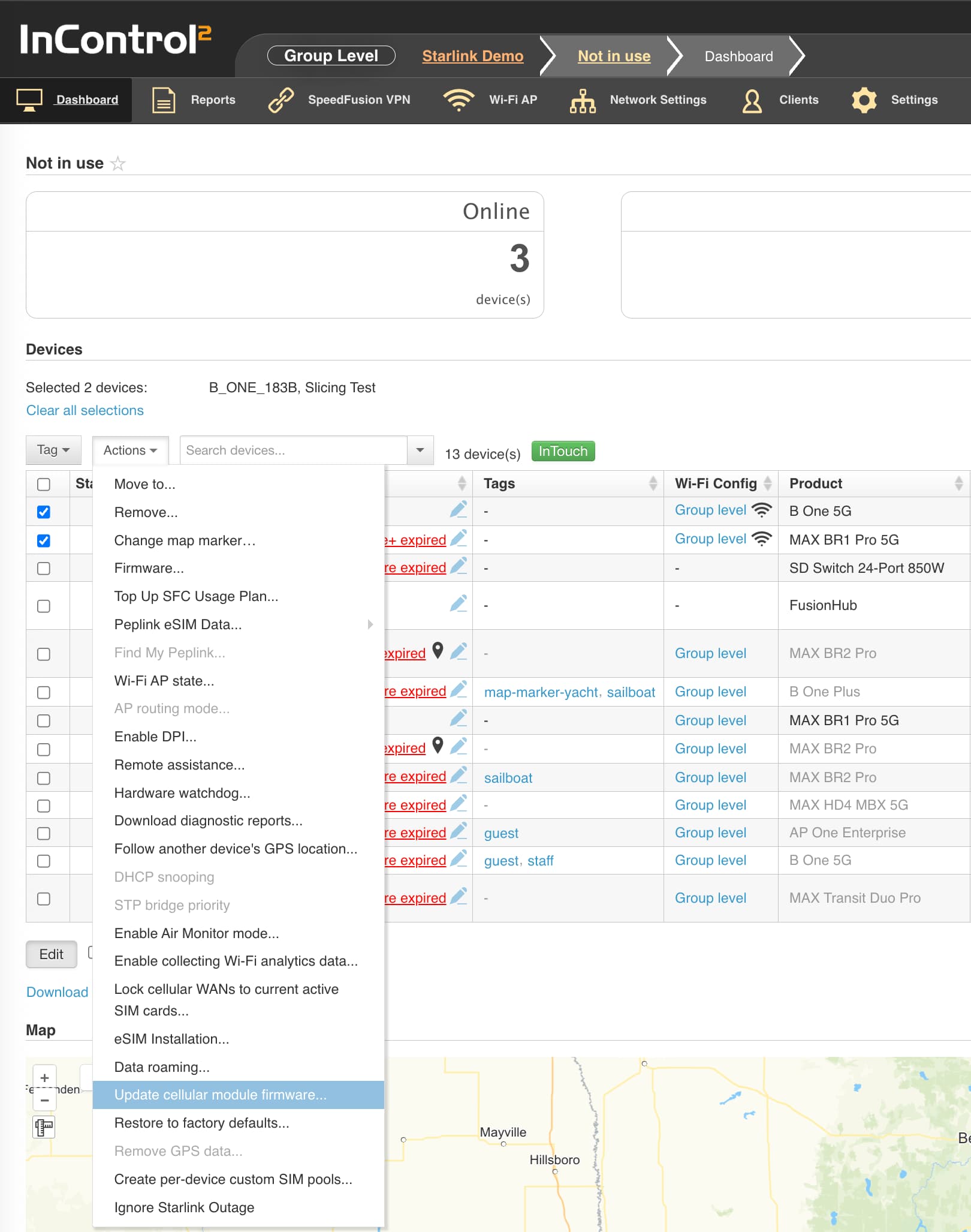 1) InControl: You can do this remotely on a single unit or at scale from the InControl Group Level. Simply select the device(s) you want to update and then open the Actions dropdown and select Update Cellular Module Firmare.