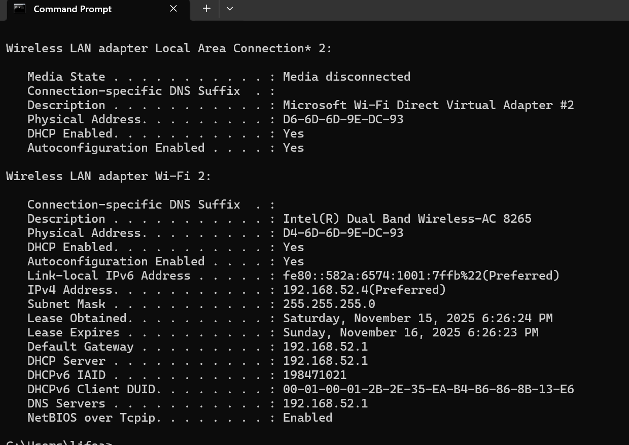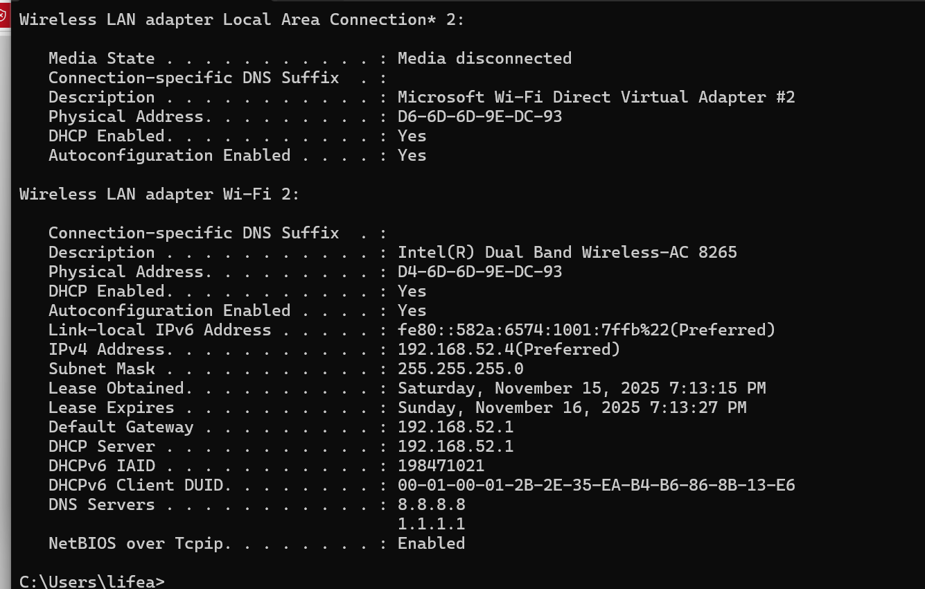 IP Config of laptop connected to HOME Wifi LAN (after dns flush/release/renew)