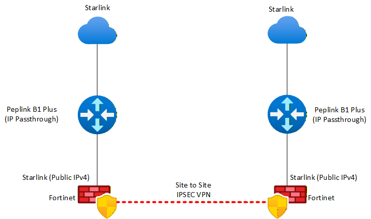 Currently trying to establish a site-to-site IPSEC VPN between two of our Fortinet firewalls. They each have a Peplink B1 plus operating in IP Passthrough in front of them. Each dish has Starlink Business with Public IPv4 addressed being handed from the Starlink to the Fortinet Firewalls. We are unable to get the IPSEC tunnel to establish between the sites.