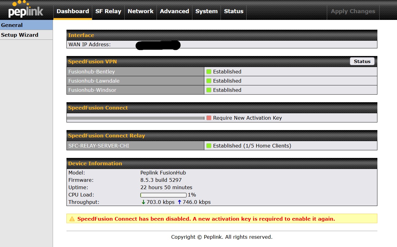 Hello I just started a new instance of Fusion Hub Solo on Vultr. I have two Prime care routers, and one essential care router attached using SpeedFusion VPN. I am using Speed Fusion relay to attach my phone using the speed fusion app. My question is just recently I saw the following “SpeedFusion Connect has been disabled. A new activation key is required to enable it again.” I am unsure what I need to do. As far as I can tell all the connections are still working. Since on the Hub there is a limited menu of options on the SF relay page does a new license enable all the features such as are on a peplink router? If anyone has experiece with this message please let me know what the steps are to fix it.