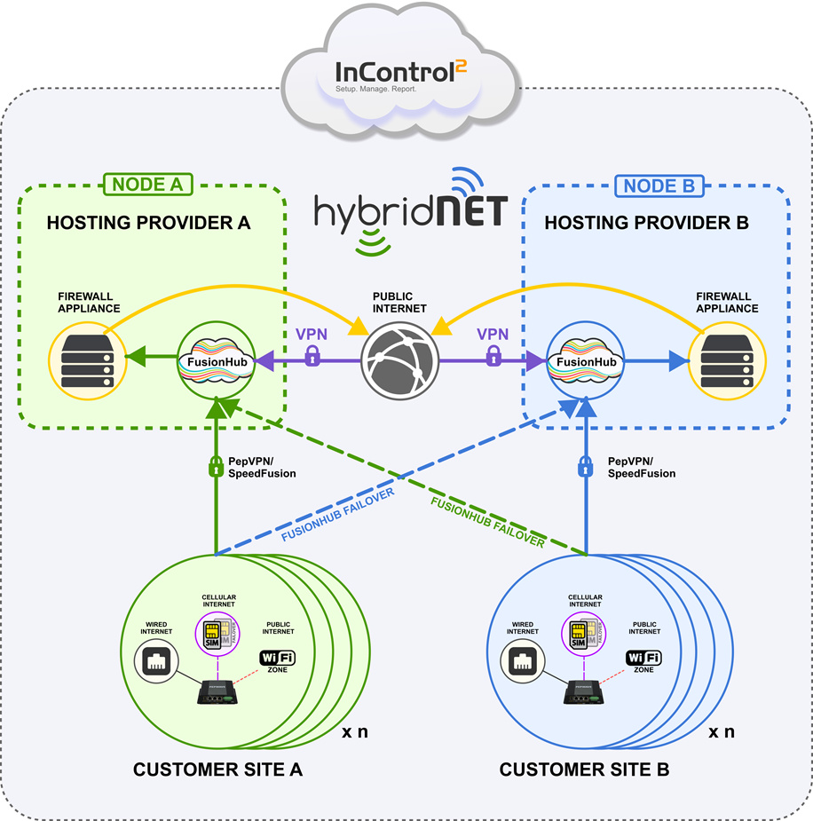 Remote devices have a primary PepVPN / SpeedFusion tunnel configured to one hosted Fusionhub node and a backup to a secondary Fusionhub. Remote sites are distributed across Fusionhubs. Fusionhubs have a PepVPN between each other. Job done.