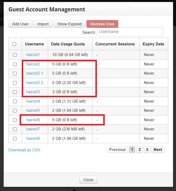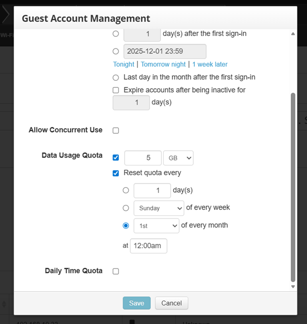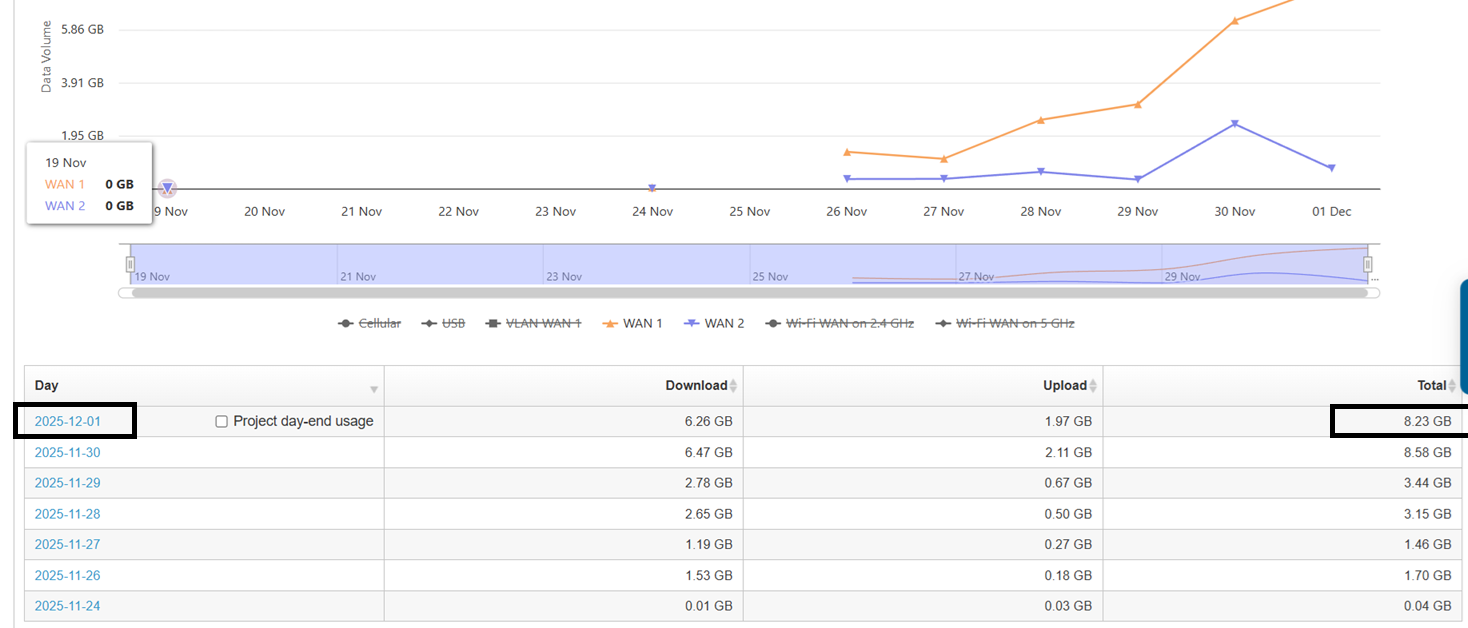 My “Bandwidth and Usage Report” for today (Dec 1st) shows very low traffic (approx 8GB total WAN), while the Guest Management screen shows users having consumed their full quotas, indicating the counter did not clear.