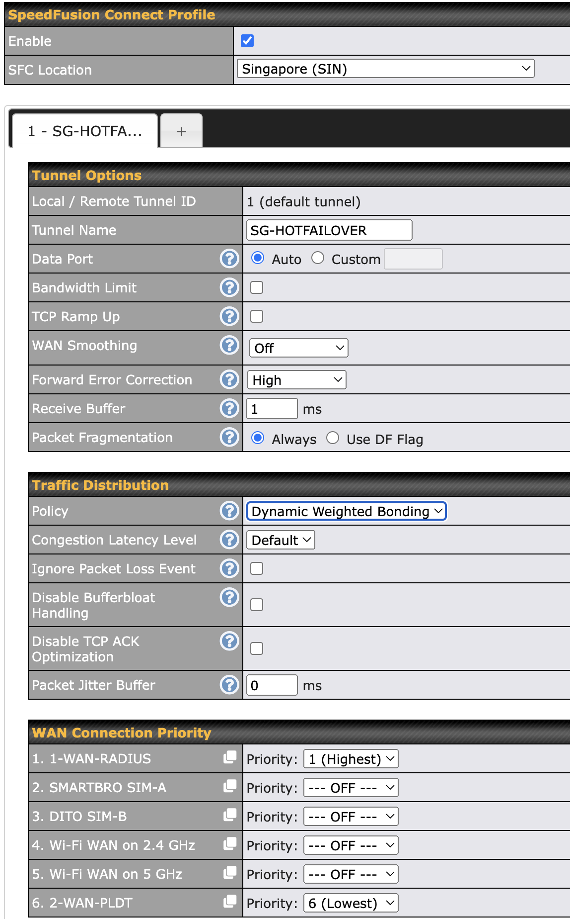 hello, Please guide me on how to configure my Pepwave MAX Transit (MAX-TST-DUO-LTEA-W. firmware version: 8.4.1) for a hot fail over for the purpose of video conference and remote server ssh connection without any downtime interruption. I want to set my ISP1 (RADIUS) as my primary and ISP2 (PLDT) is my secondary standby hot fail over.
