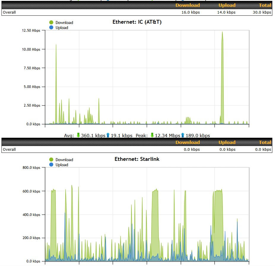 How it works: All traffic will use Starlink first. When Starlink reaches its bandwidth limit (500 kbps), additional traffic automatically overflows to your second WAN connection. Both connections can work simultaneously when you need more than 500 kbps.