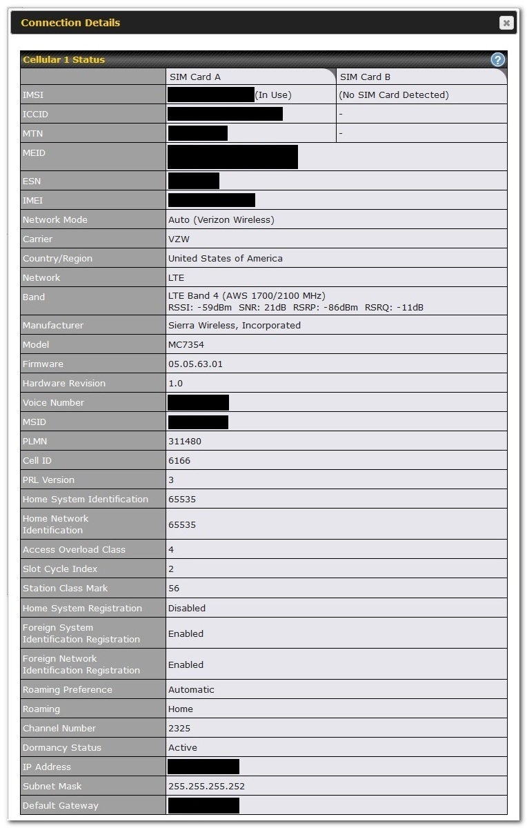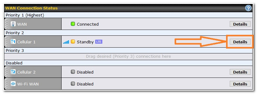 In devices with embedded cellular modems you can access detailed cellular information by enabling detailed engineering data. To do this begin by accessing the web admin. Once logged in to the device, from the “Dashboard” page click on the “Details” button for the cellular WAN link.