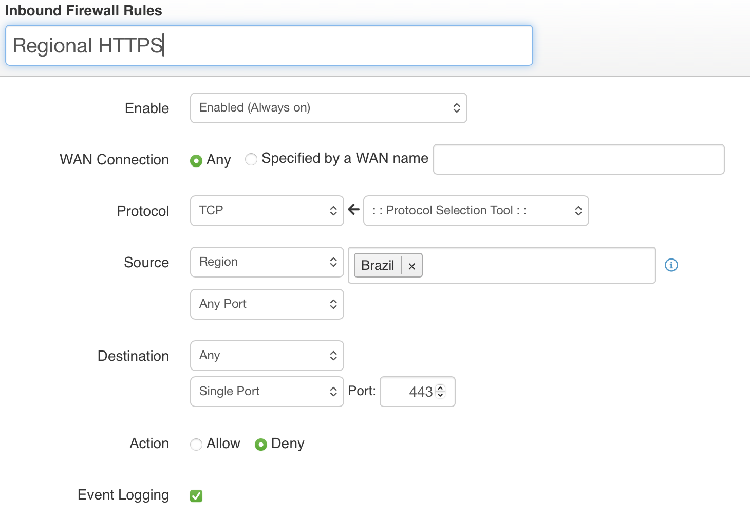 - set up a regional firewall rule to block all 443 traffic from Brazil: