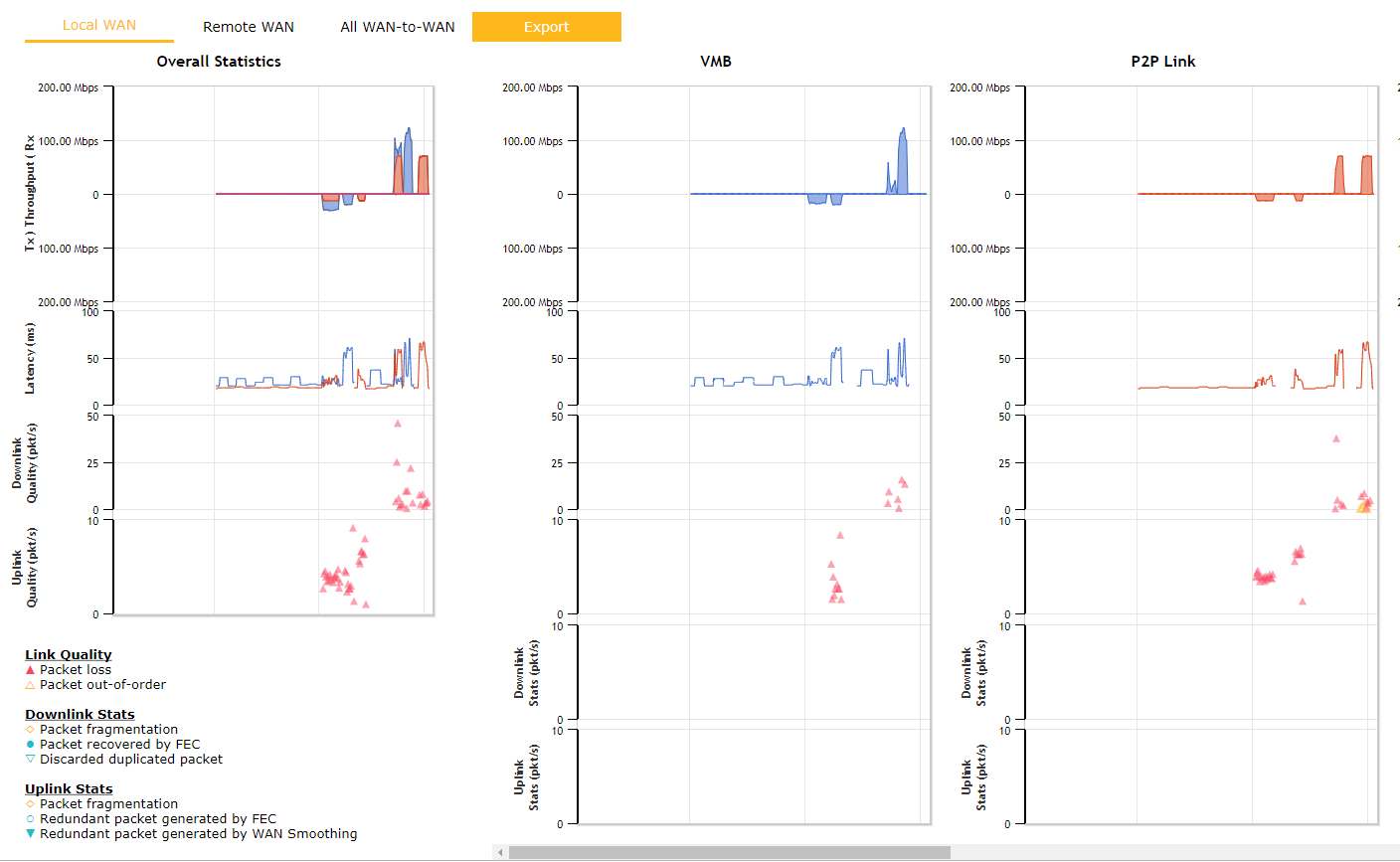 These graphs take a bit of interpretation. Mine shows me that although my upload bandwidth is bonding well, download is not working as well. Combined download bandwidth is around 100Mbps whereas separately WAN1 can do over 100MBps and WAN2 can do 70MBps. If I really wanted to chase down the underlying issue here I would look at why there is so much packet loss first and try and fix that. Packet loss on a link is the biggest cause of underperforming bandwidth when using SpeedFusion.