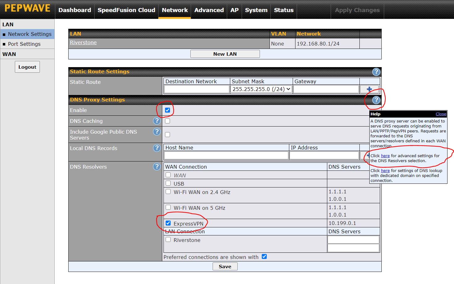 Your clients are using the Peplink as their DNS it sounds like… if you set the clients behind your Peplink with the DNS server of your VPN provider does that all work as expected?