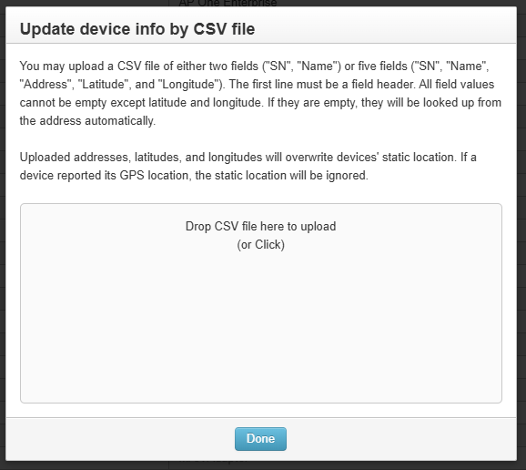 It can be found just below both the organization and group level device lists as “Update device info by CSV file”