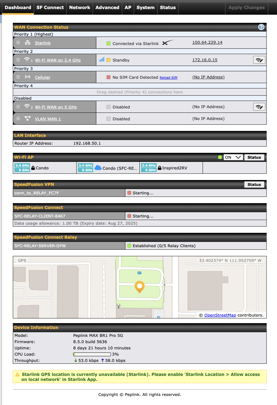 OK. The BR1 Pro 5G is connected to Starlink and is in my RV.