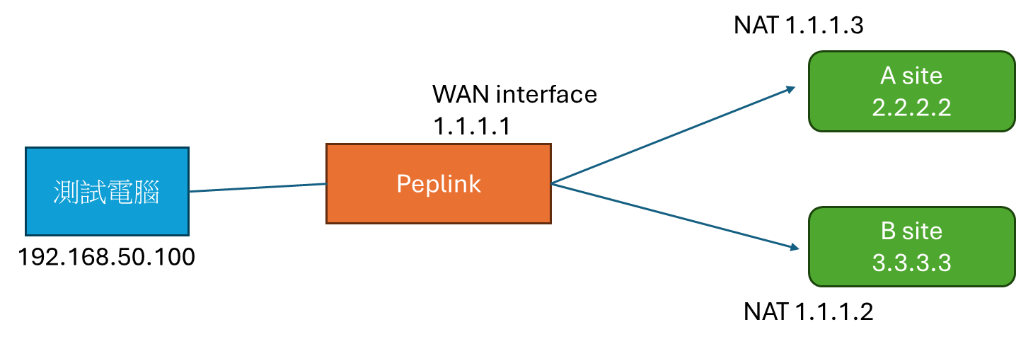 Hi Support, Current Test Status The Peplink device is currently configured with a single WAN connection. The client’s requirement is to designate a specific NAT IP based on the destination IP, as illustrated in the attached diagram.