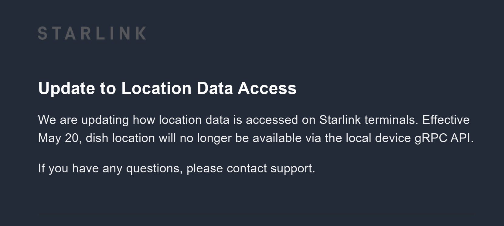 If you are using a b one , br1 mini 5g, or otherwise not using a GPS antenna for local access this awesome integration is going away due to changes with Starlink!