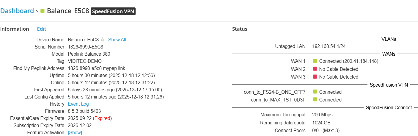 Also , I noticed that , I´m sending 8.6 Mbps trough the MAX TST , in the Balance 380 I only see 3.4 Mbps of traffic…very strange , and of course I cannot see the UDP in my VLC. The Speedfusion is configured as Mesh , with Max TST , Balance 380 and B one ( this last is in my office ) , can be a problem this mesh ?