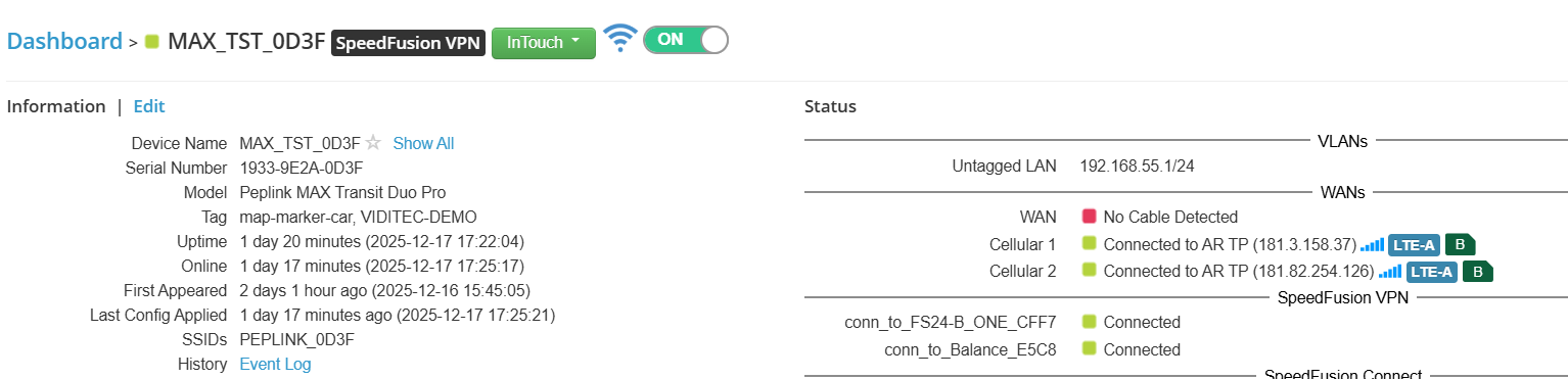 At 192.168.55.1 is the Max Transit Duo Pro , and a encoder is at 192.168.55.15 at it´s LAN port , I can ping both from mi notebook perfectly , but the UDP is impossible to ping I think , is only a stream. That encoder is generating the UDP , it´s a multicasting broadcasting from 192.168.55.15 to the LAN port of Max Transit. Other question , how can I do a L2 tunnel ? In the Max Transit or in the speedfusion config ? Thanks for helping !!!
