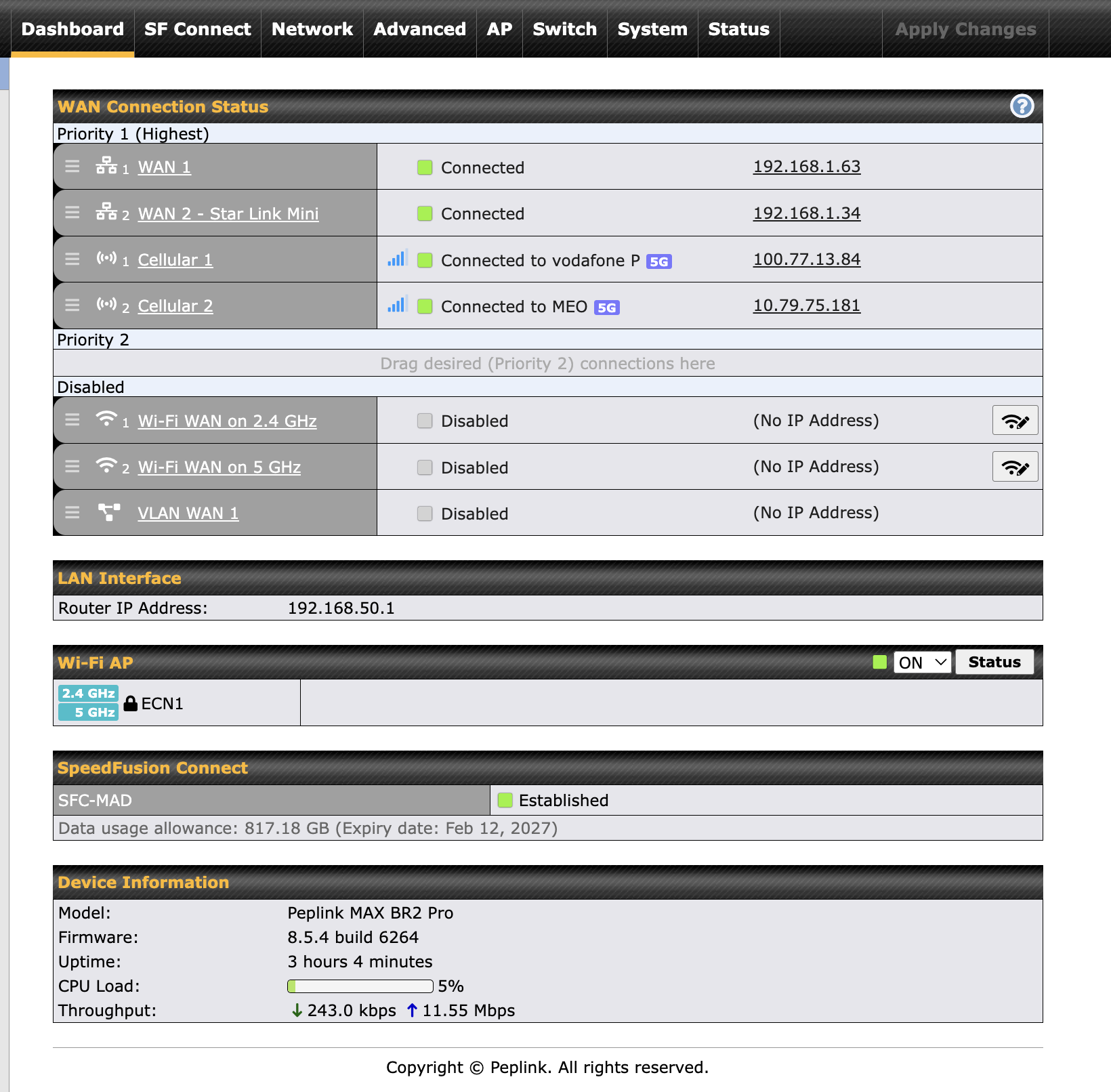 We currently use 2 Starlinks and 2 local simcards with Speedfusion.