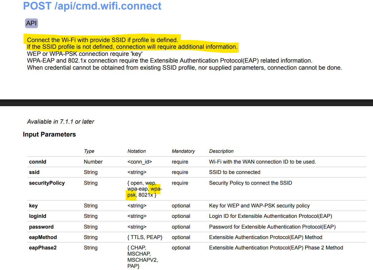 I am trying to make WiFi Wan connection available via device APIs. I am using /api/cmd.wifi.connect endpoint, when there is a saved security policy on that WAN, only providing the SSID and policy key is enough to make the connection, but for new SSIDs I get this error: