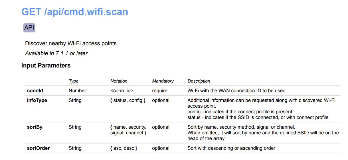 I am going to scan available WiFi networks and connect to any of them by setting the SSID and its password. So far I managed to get list of available networks by query the /api/cmd.wifi.scan
