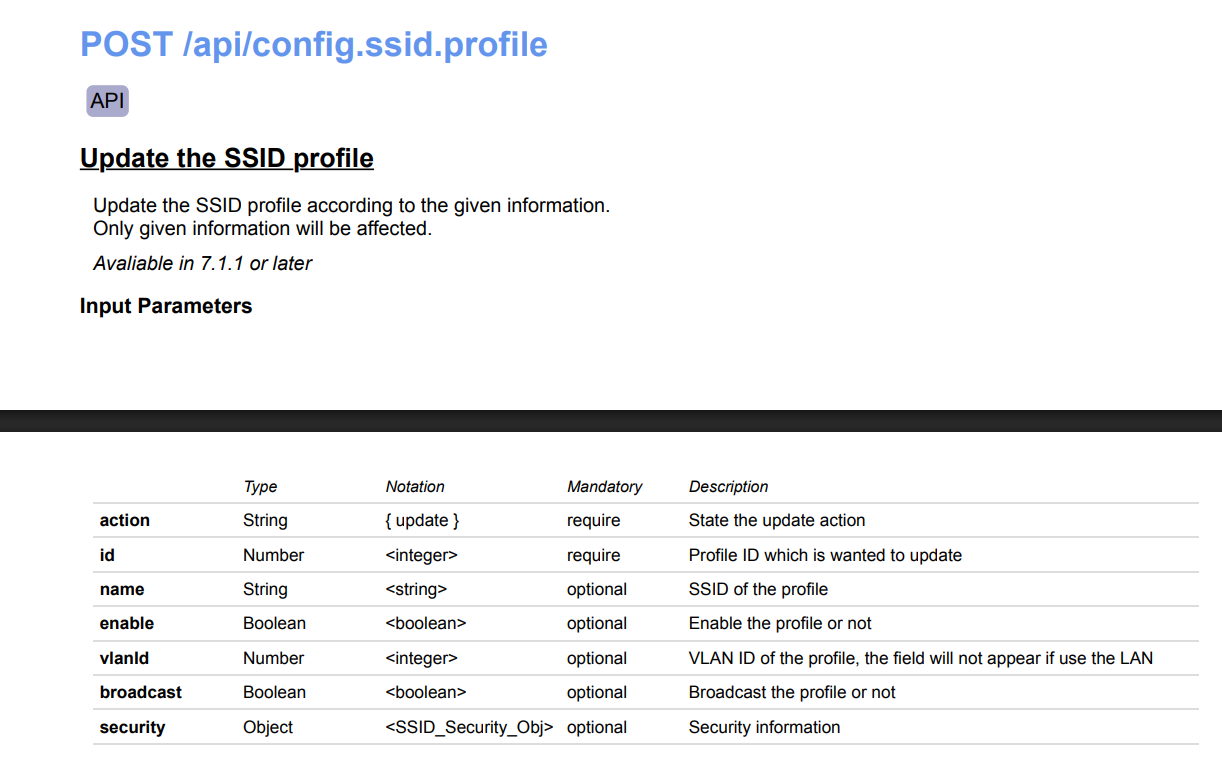 Other endpoint /api/config.ssid.profile for SSID profiles only provides “update” action and I have no idea how I can create new profile for new network: